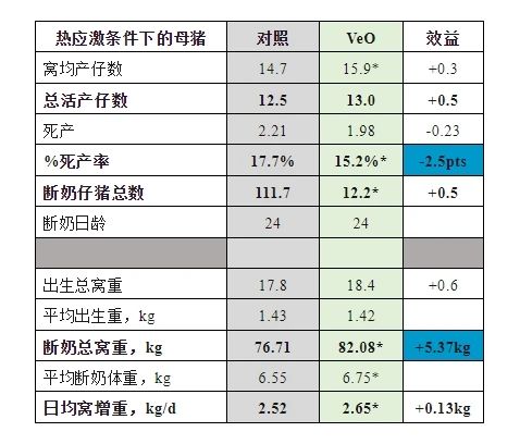 表1. 母豬在熱應激條件下的產仔性能(*p<0.05)